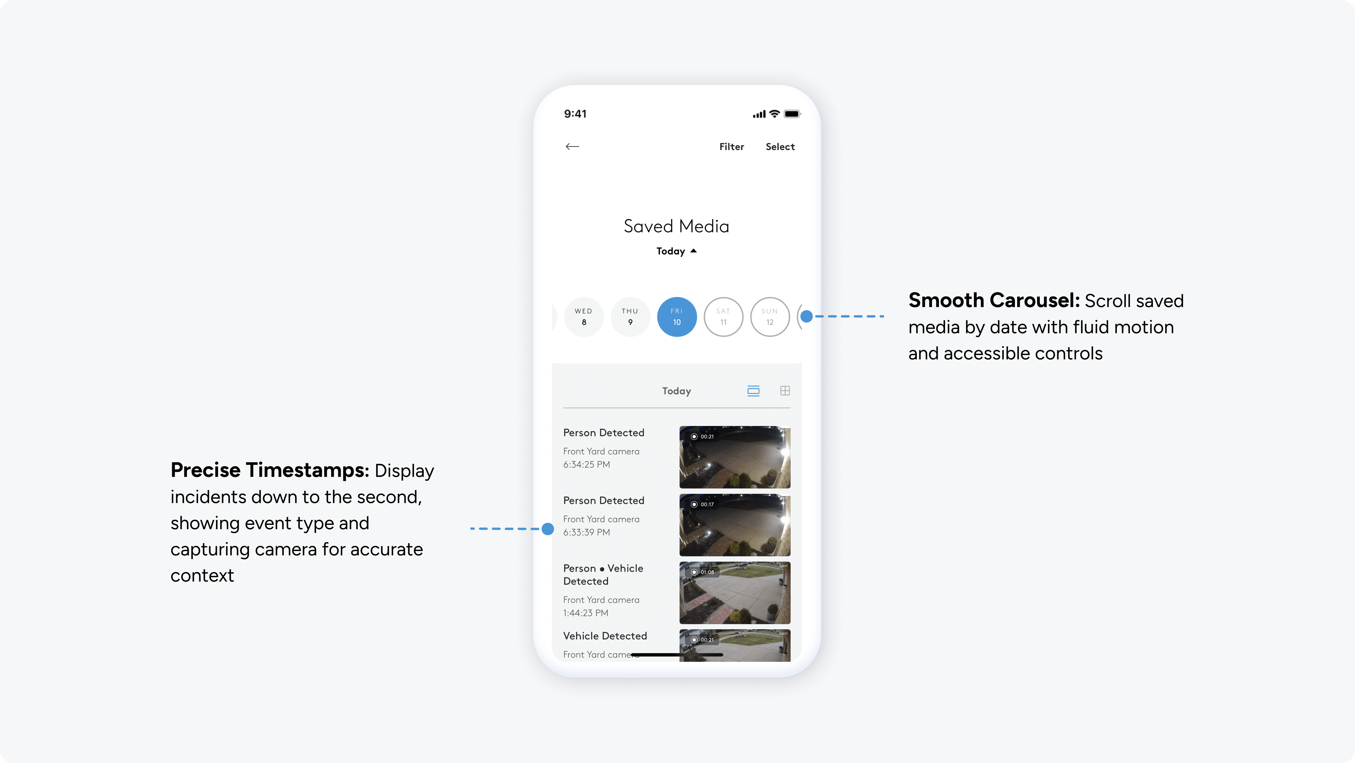 Quickly providing access to Google AI smart camera saved footage through personalized organization and filters.
