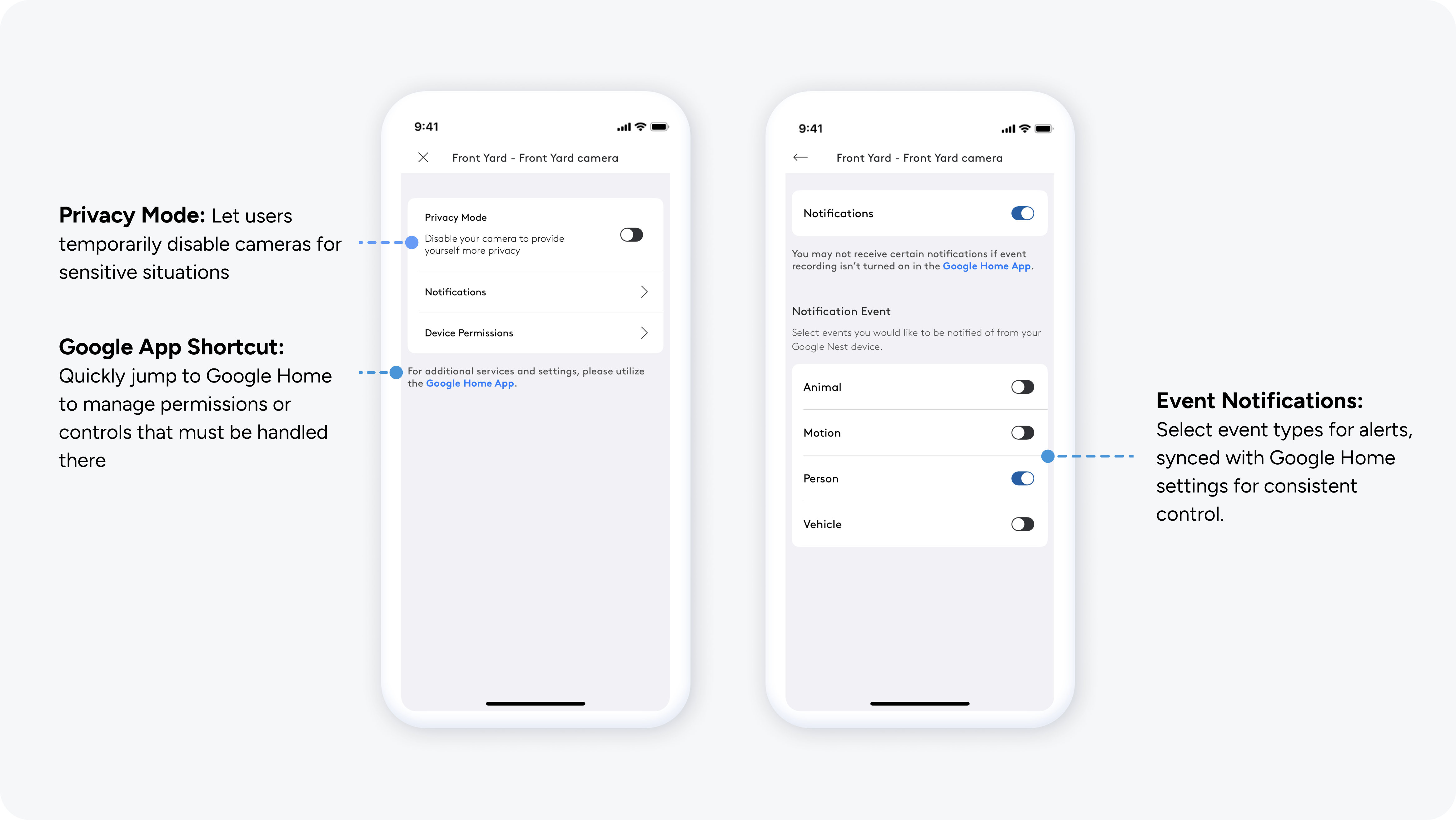 Managing security in intimate spaces requires absolute user control. I integrated clear, compliant privacy toggles to manage the tension between surveillance and home privacy.