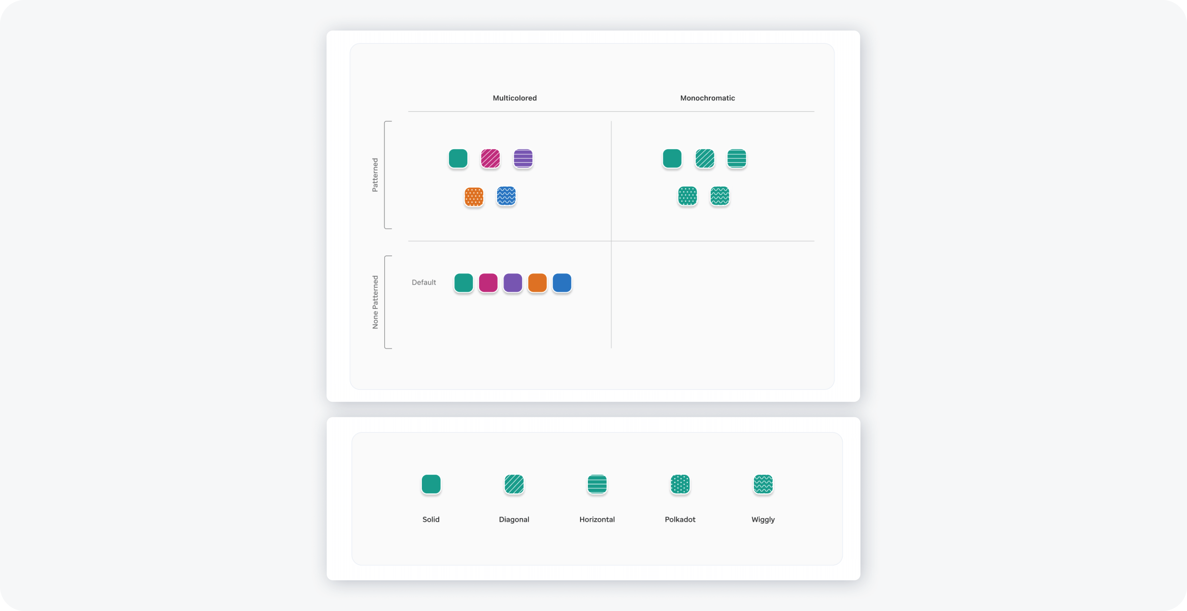 • Iterative design tested patterns (solid, diagonal, horizontal, polkadot, and wiggly) for readability, particularly when color alone may not suffice. Legends were placed directly beneath charts for optimal clarity.