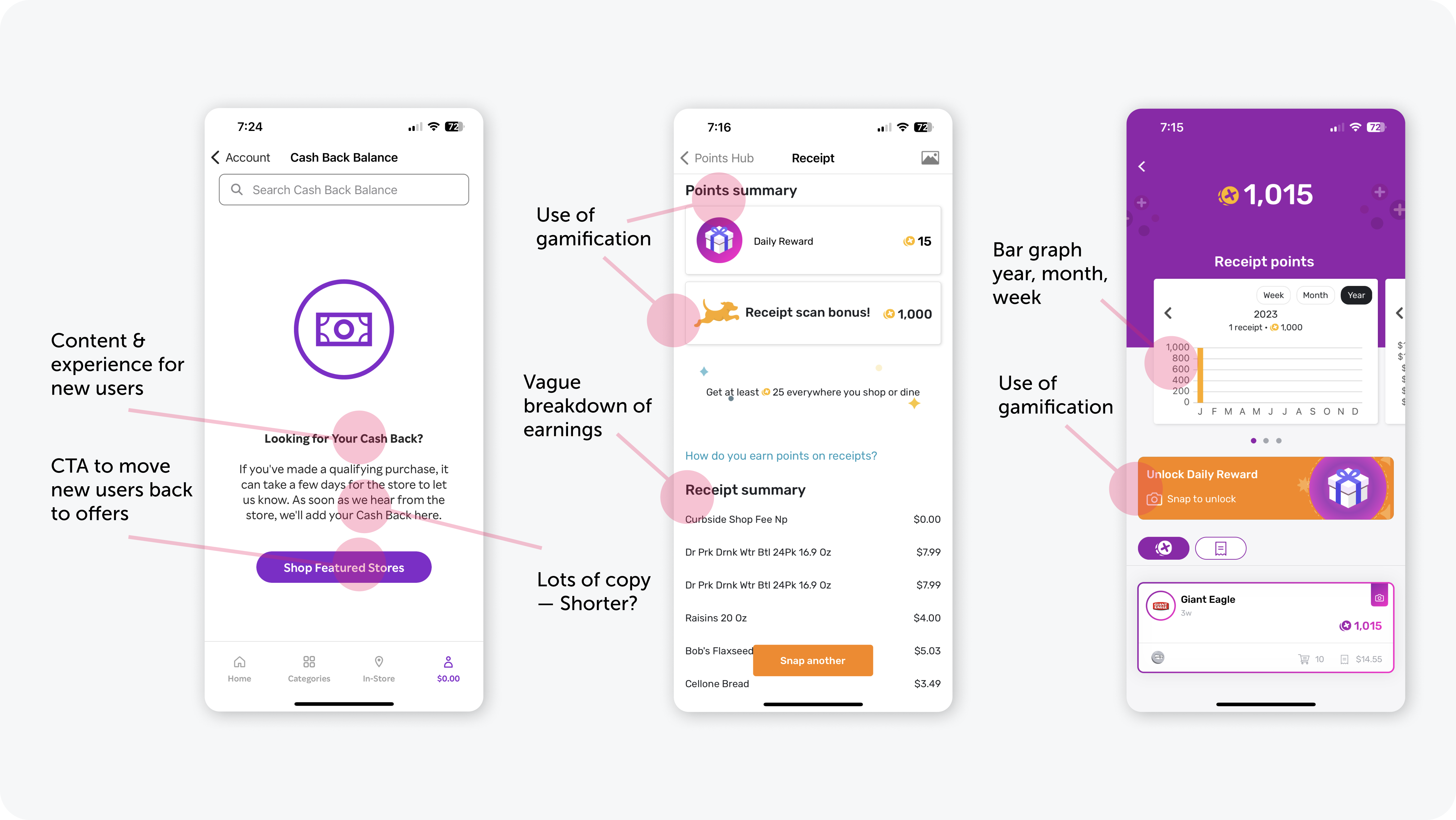 Insights revealed contrasting approaches: Fetch delivered gamified experiences but often lacked clear earnings visibility, while Capital One emphasized robust data presentation.